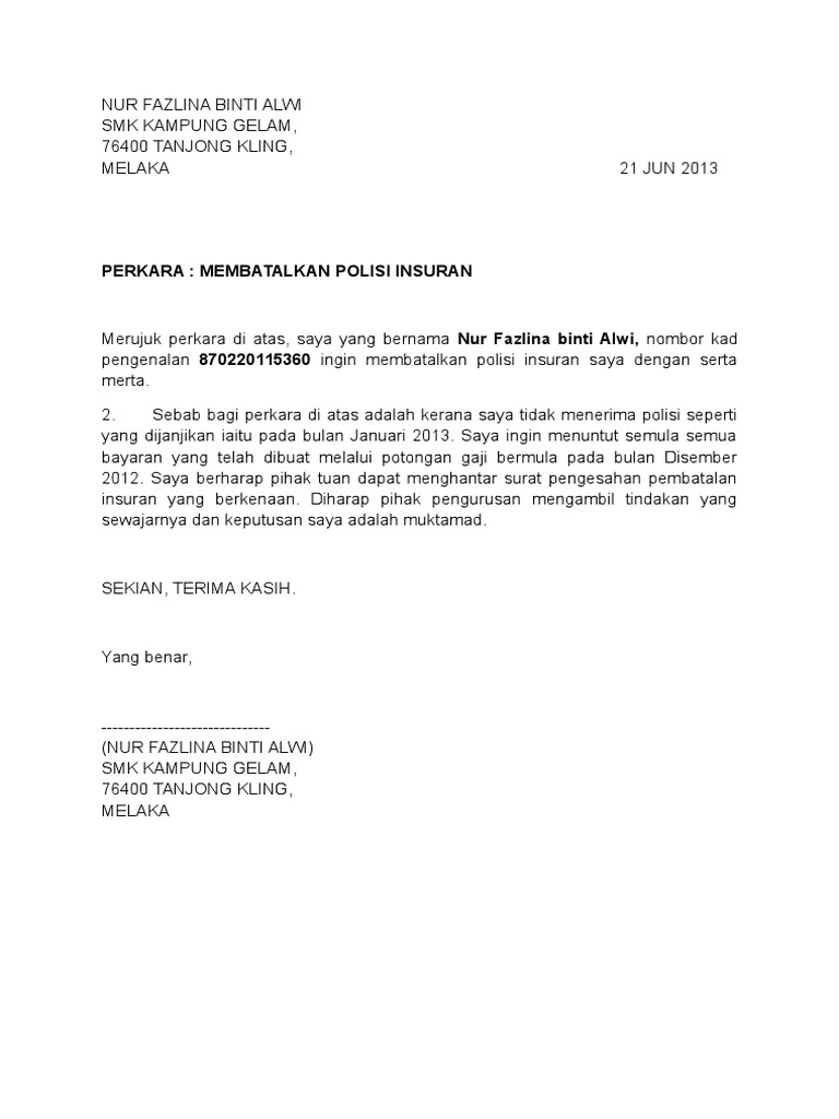 Ini adalah contoh surat pembatalan polisi insurans yang boleh anda salin dengan sedikit perubahan. Contoh Surat Berhenti Bayaran Insurans Contoh Surat. Bertanya khabar berita 4.